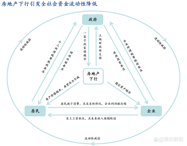 據(jù)前文所述,需求疲軟是物價低迷的表觀原因,深究則可能是消費者的資產(chǎn)負(fù)債情況惡化以及收入預(yù)期轉(zhuǎn)差:地產(chǎn)行業(yè)進入下行周期,房價的持續(xù)下跌一方面導(dǎo)致居民和企業(yè)的資產(chǎn)負(fù)債表惡化,縮減支出;另一方面也使財政收入承壓,疊加前期擴表的債務(wù)清償壓力,共同導(dǎo)致社會流動資金縮水。